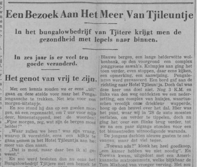 Dan begitu diputuskan untuk mengunjungi Perusahaan Bungalow Cicere. Saya pernah menginap di sana selama sebulan pada tahun 1928 dan ingin melihat perubahan yang terjadi dalam beberapa tahun terakhir. Sejak itu, saya selalu melihat iklan-iklan mencolok di surat kabar besar Jawa, dan menyimpulkan bahwa pasti ada sesuatu yang berubah, tetapi juga teringat pepatah: “ Maklum, Kakao (produk coklat) Van Houten adalah yang terbaik”, sementara Blooker mengklaim hal yang sama di halaman iklan yang sama. Hal ini sangat bertentangan dengan baik, lebih baik, terbaik, yang telah ditanamkan oleh guru kami dengan contoh-contoh yang jelas.