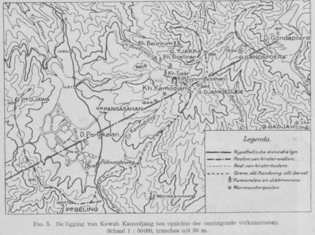 Di daerah sekitarnya hanya ada beberapa sisa-sisa dinding cincin yang teramati: dinding Pangkalan, yang sebagian menutupi dataran Inggris (Danau Pangkalan) di sebelah barat, dinding kecil yang curam di sebelah timur Kawah Kamodjang, dan dinding yang di atasnya terdapat G. Gandapoera dan di dalamnya terdapat Danau dengan nama yang sama (lihat Gbr. 3). Dinding kawah, yang dapat direkonstruksi dari sini, terletak pada jurus NE-SW, yang membentang sejajar dengan garis patahan, yang – seperti yang akan kita lihat nanti – memainkan peran penting dalam pembentukan Pegunungan Goentoer. Punggungan D. Tjiharoes, yang terletak lebih jauh ke arah barat, juga terletak pada garis yang sama. Oleh karena itu, kami menduga bahwa lapangan fumarol Kawah Kamodjang terkait dengan dislokasi yang sama, di mana produk vulkanik yang membentuk gunung berapi Gandapoera dan Pangkalan yang dulu terdorong ke atas.
