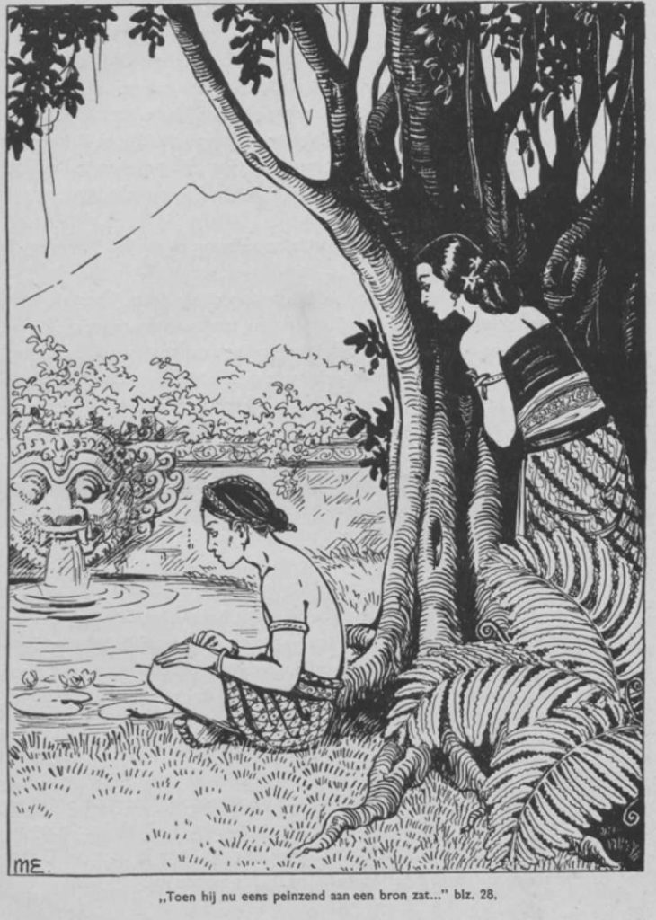 Ketika dia duduk termenung di dekat sebuah mata air di bawah naungan pohon waringin, dia melihat pantulan wajah seorang wanita di air mata air tersebut, yang lebih cantik dari siapa pun. Dia mendongak, berbalik, dan memberi salam hormat, dengan tangan di depan dahi, mulut dan dada tertutup, lalu membungkuk dan menyapa wanita itu, yang menatapnya dengan heran. “Dari mana Anda datang dan ke mana Anda ingin pergi, raden ayu?”