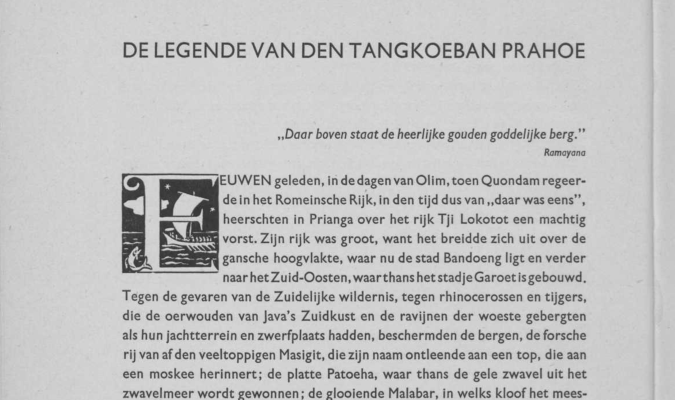 Berabad-abad yang lalu, pada zaman Olim, ketika Quondam memerintah di Kekaisaran Romawi, pada masa “dahulu kala”, di Prianga memerintah kerajaan Tji Lokotot (Cilokotot, saat ini disebut Kopo) seorang raja yang perkasa. Kerajaannya sangat luas, karena membentang di seluruh dataran tinggi, di mana kini terletak kota Bandoeng, dan ke arah tenggara, di mana kini dibangun kota Garut. Menentang ancaman bahaya hutan belantara selatan, melawan badak dan harimau, yang menjadikan hutan belantara pantai selatan Jawa dan jurang pegunungan liar sebagai tempat berburu dan berkeliaran, melindungi pegunungan, deretan kokoh dari Masigit yang berpuncak banyak, yang namanya diambil dari puncak yang mengingatkan pada masjid; G. Patuha yang datar, di mana saat ini belerang kuning diekstraksi dari danau belerang; Malabar yang bergelombang, di lembahnya dibangun mahakarya Dr. de Groot yang abadi, “Malabar Radio”; Malabar, di mana karya pionir Bosscha dan Kerkhovens serta Kerbosch memperoleh ketenaran dunia, karena teh dan kina dari perkebunan di dataran tinggi Pengalengan merupakan yang terbaik di dunia; Gunung Tilu, yang disebut Drieberg (tiga kerucut), karena Junghuhn tidak pernah melihat lebih dari tiga dari empat puncaknya sekaligus; dan ketiga puncak: Wayang, yang tidak boleh didaki, karena di puncaknya tersembunyi benda-benda kuno yang memiliki kekuatan untuk membunuh siapa pun yang berani membangunkan mereka dari tidur abadi (dan bijaksana untuk tidak meragukannya, karena orang Sunda siap untuk mewujudkan ramalan itu jika perlu), Welirang dengan kawahnya yang berasap, dan Bedil.