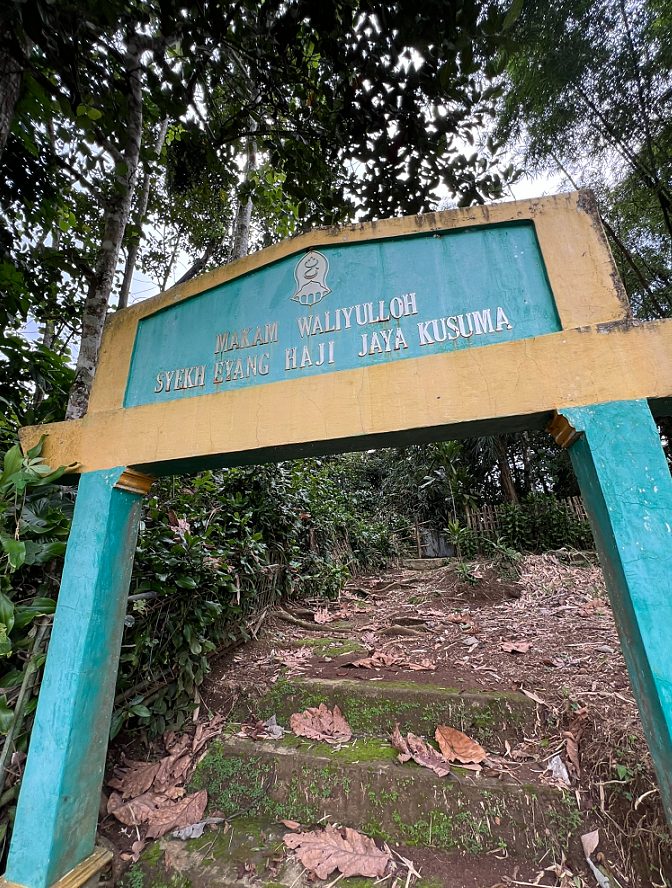 Kondisi jalan semakin ke hulu, semakin menyempit. Kemudian sekitar kampung terakhir, kemudian berbelok ke arah barat melalui pabrik penggergajian. Kurang lebih sekitar 500 meter, tiba di kompleks pemakaman. Dari tepi jalan kemudian disambut oleh gapura yang bertuliskan Makam Waliyullah Syekh Eyang Haji Jaya Kusuma. Keberadaan makam berada pada bukit kecil, dinaungi pohon bambu yang rindang. Tersedia jalan setapak yang telah di tembok mengantarkan hingga gerbang makam.