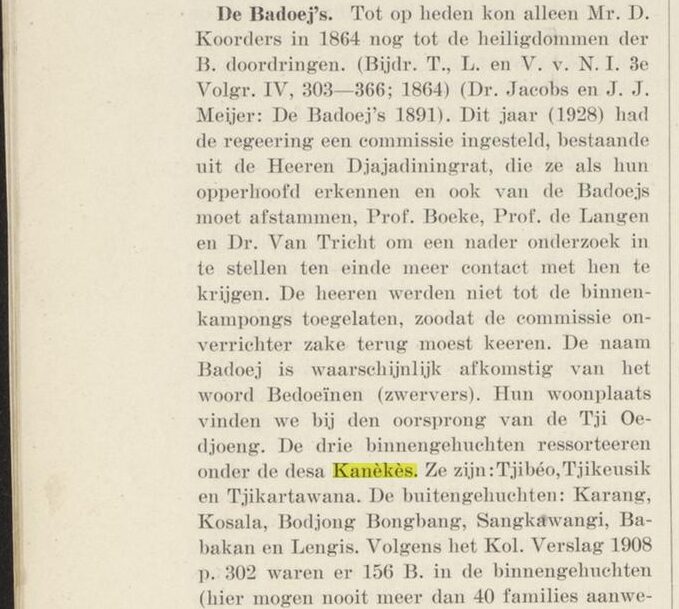 Hingga saat ini, hanya Tuan D. Koor der s pada tahun 1864 yang berhasil memasuki tempat-tempat suci suku Baduy. (Bijdr. T., L. dan V. v. N. 1. 3e Volgr. IV, 303—366; 1864) (Dr. Jacobs dan J. J. Meijer: De Badoej’s 1891). Tahun ini (1928), pemerintah telah membentuk sebuah komisi yang terdiri dari Tuan Djajadiningrat, yang mereka akui sebagai kepala suku mereka dan juga diduga berasal dari suku Baduy. Prof. Boeke, Prof. de Langen, dan Dr. Van Triclit untuk melakukan penyelidikan lebih lanjut guna menjalin kontak yang lebih erat dengan mereka. Para tuan tersebut tidak diizinkan masuk ke desa-desa Baduy, sehingga komisi tersebut harus kembali tanpa hasil. Nama Baduy kemungkinan berasal dari kata Bedouin (pengembara). Tempat tinggal mereka menempati di hulu Ci Ujung.